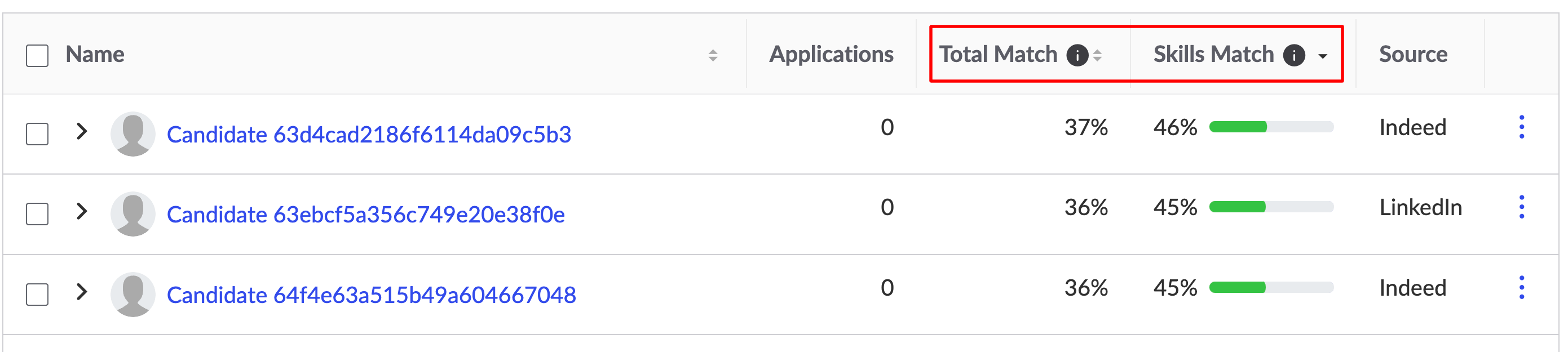 - The Total Match score also incorporates non-skill factors such as relevant experience, job type, location and compensation preference. A detailed breakdown is provided in the expanded candidate card.