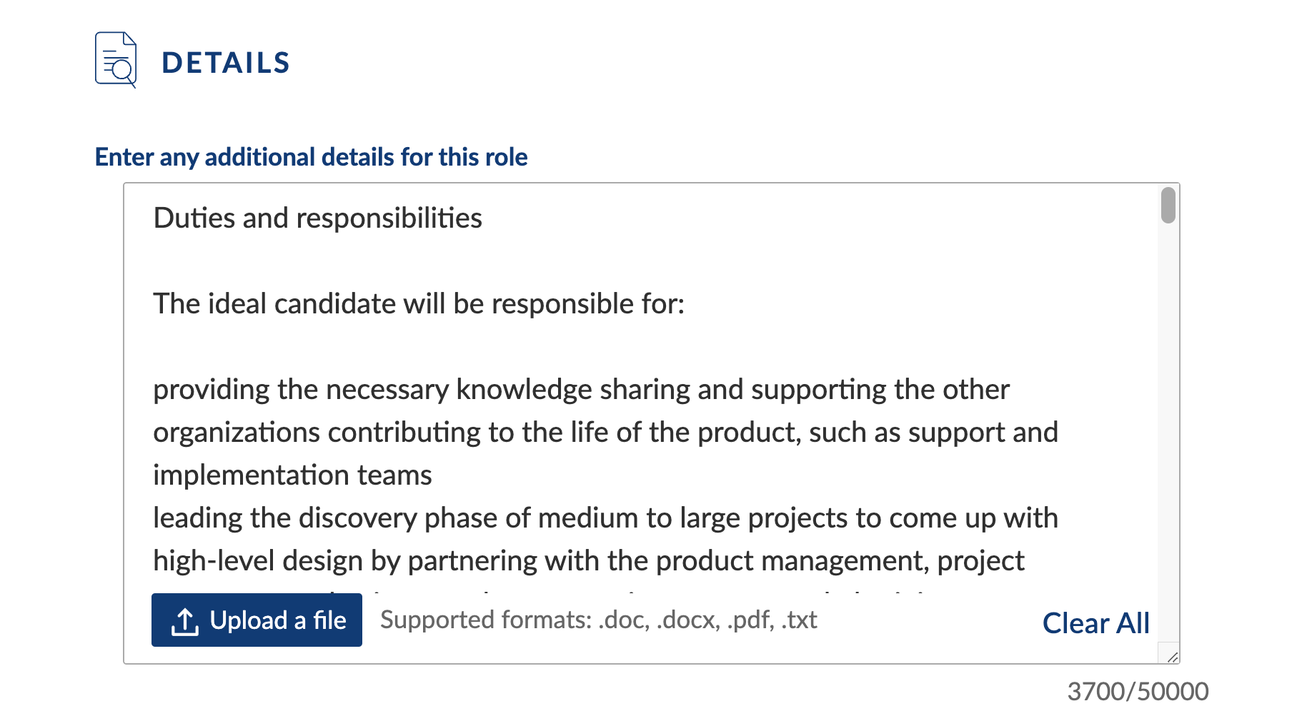 Step 10: Under the DETAILS section, you can view and adjust your job description if you have uploaded one, or you can enter any additional details for the role if you didn't upload a job description.