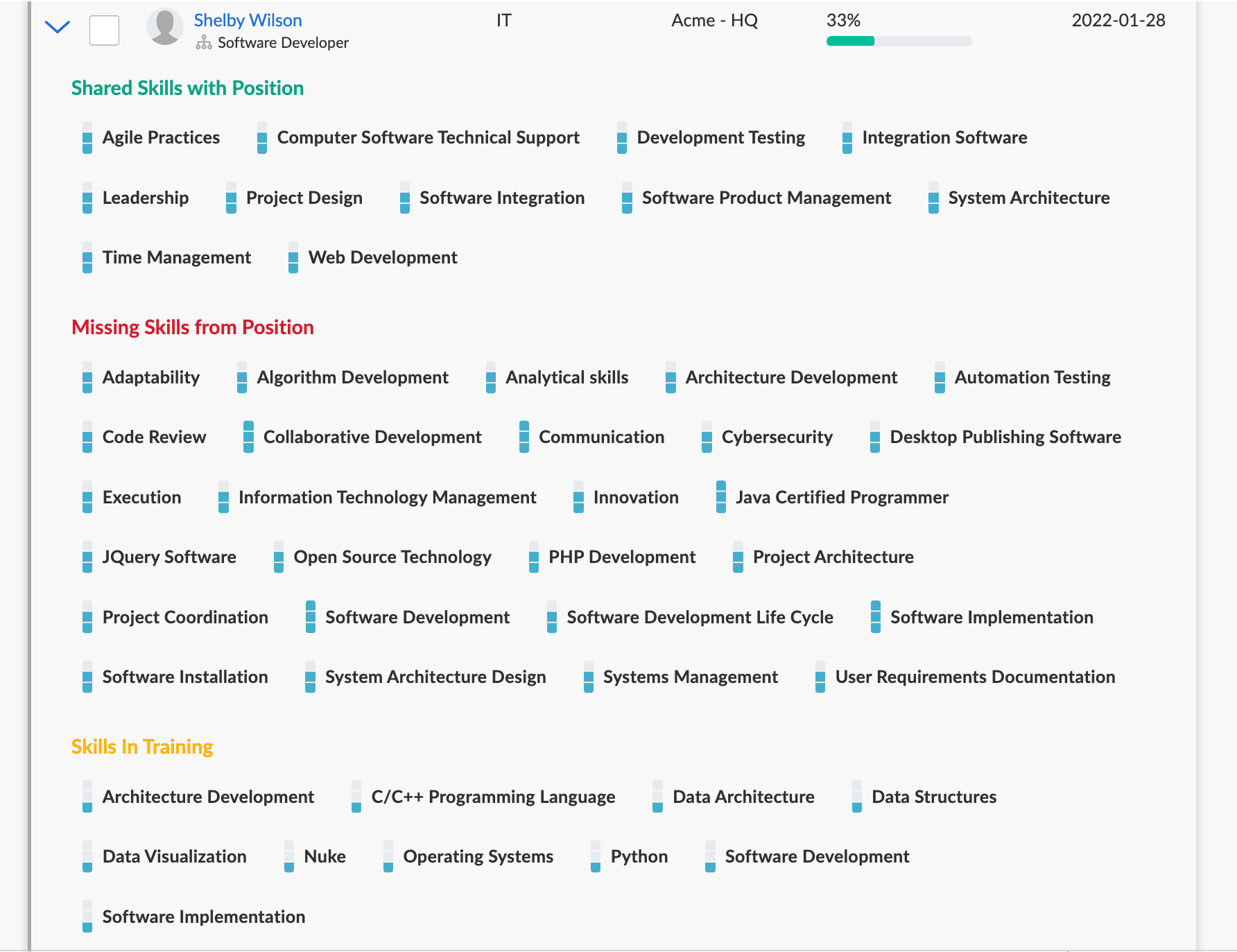 Step 3: You can select any employee profile by clicking on the blue arrow next to their name and receive an overview of Shared Skills, Skills to Train, and Skills in Training related to a Position with your Enterprise.