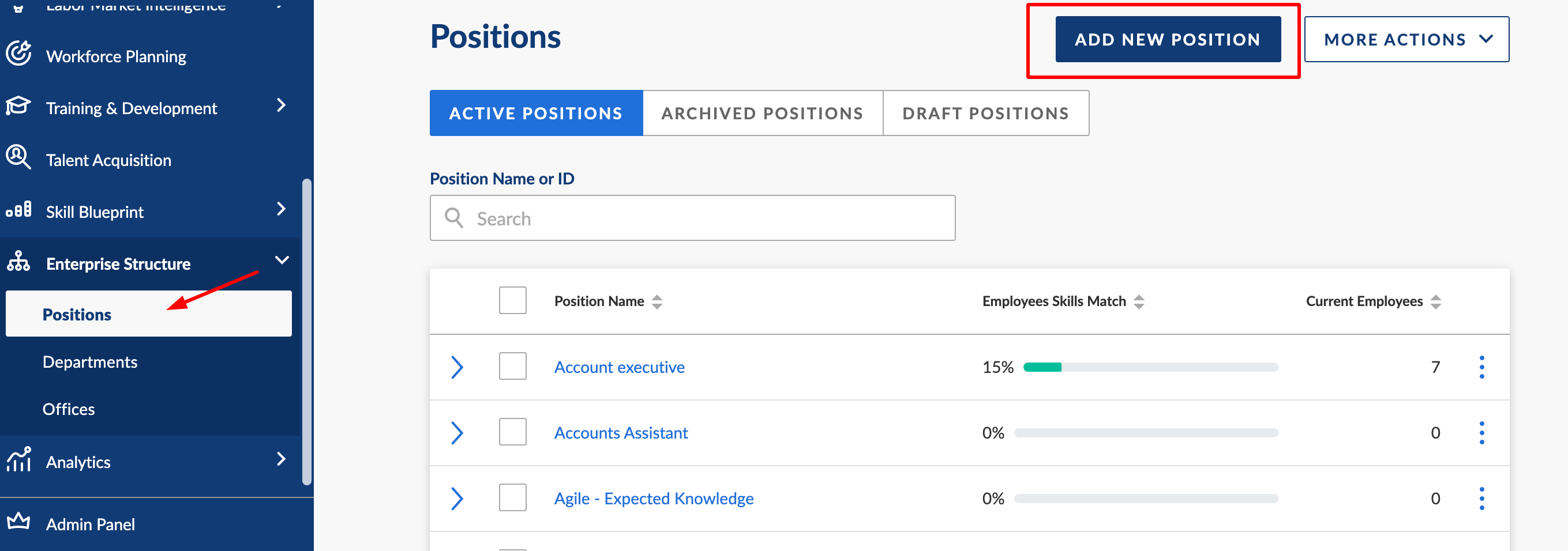 Step 2: Under the POSITIONS tab, you can add a new position or view/edit an existing position to define the skills and capabilities required for this particular role.
